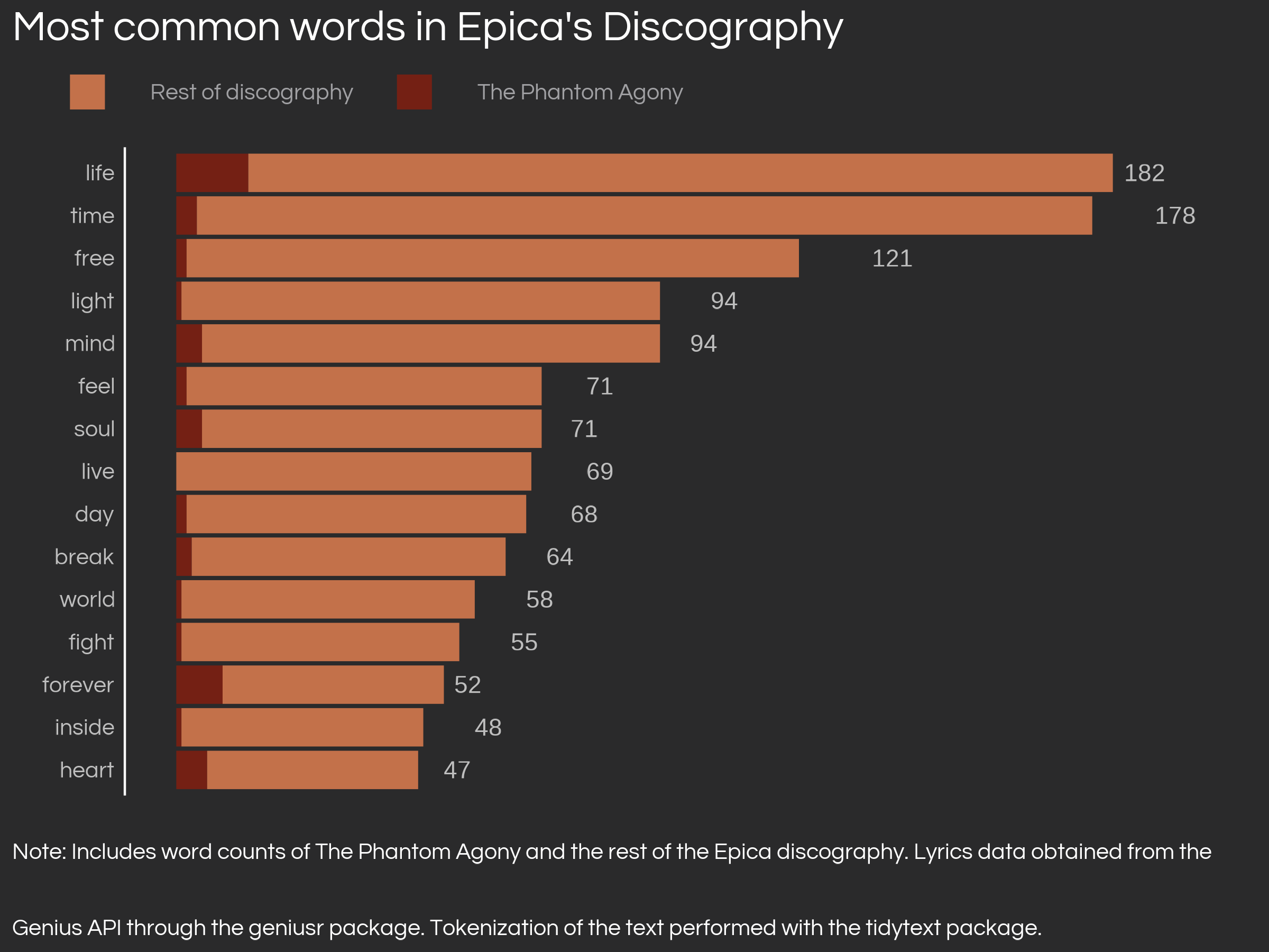 Part of a personal blog post which uses several musical data sources to perfom analyses of musical data on the dutch symphonic metal band, Epica. I perform tidy text analysis with different lexicons after tokenizing all lyrics from Epica’s discography, sourced from the Genius API. It involved complex data cleaning through table reshaping, record linkage and fuzzy joins.