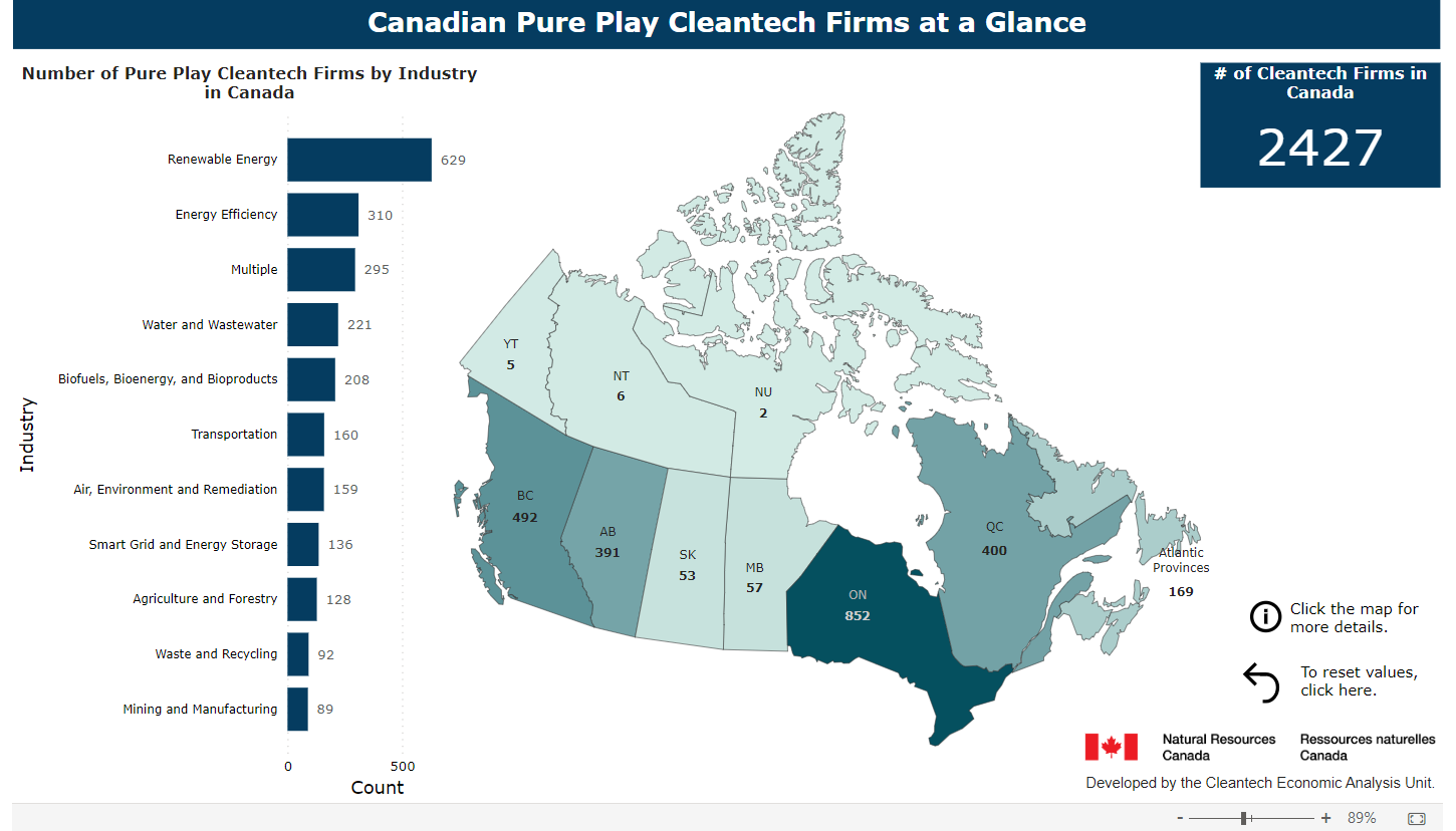 A Power BI Dashboard that visualizes the number of Canadian pureplay clean technology companies across provinces and subindustries in the country.