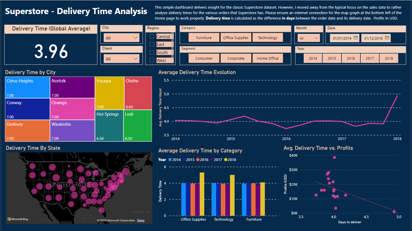 I give the classic Superstore dataset a twist by analyzing delivery times instead of sales in this Power BI dashboard. Be sure to turn on maps from your security options in Power BI desktop to see the full functionality of the file.
