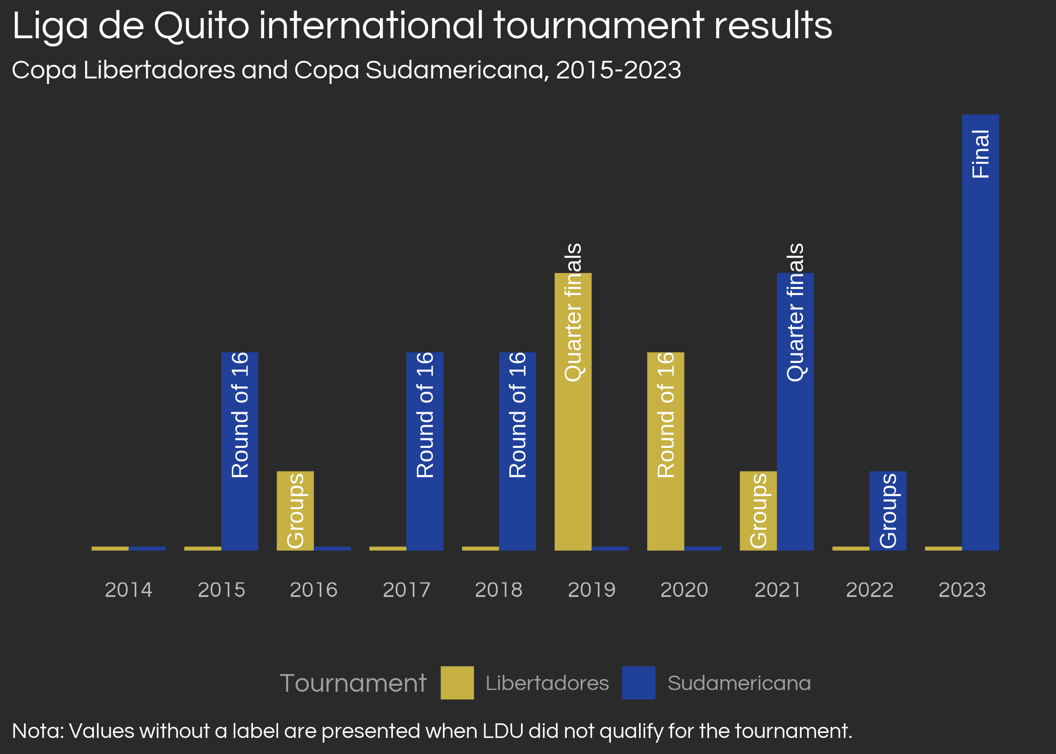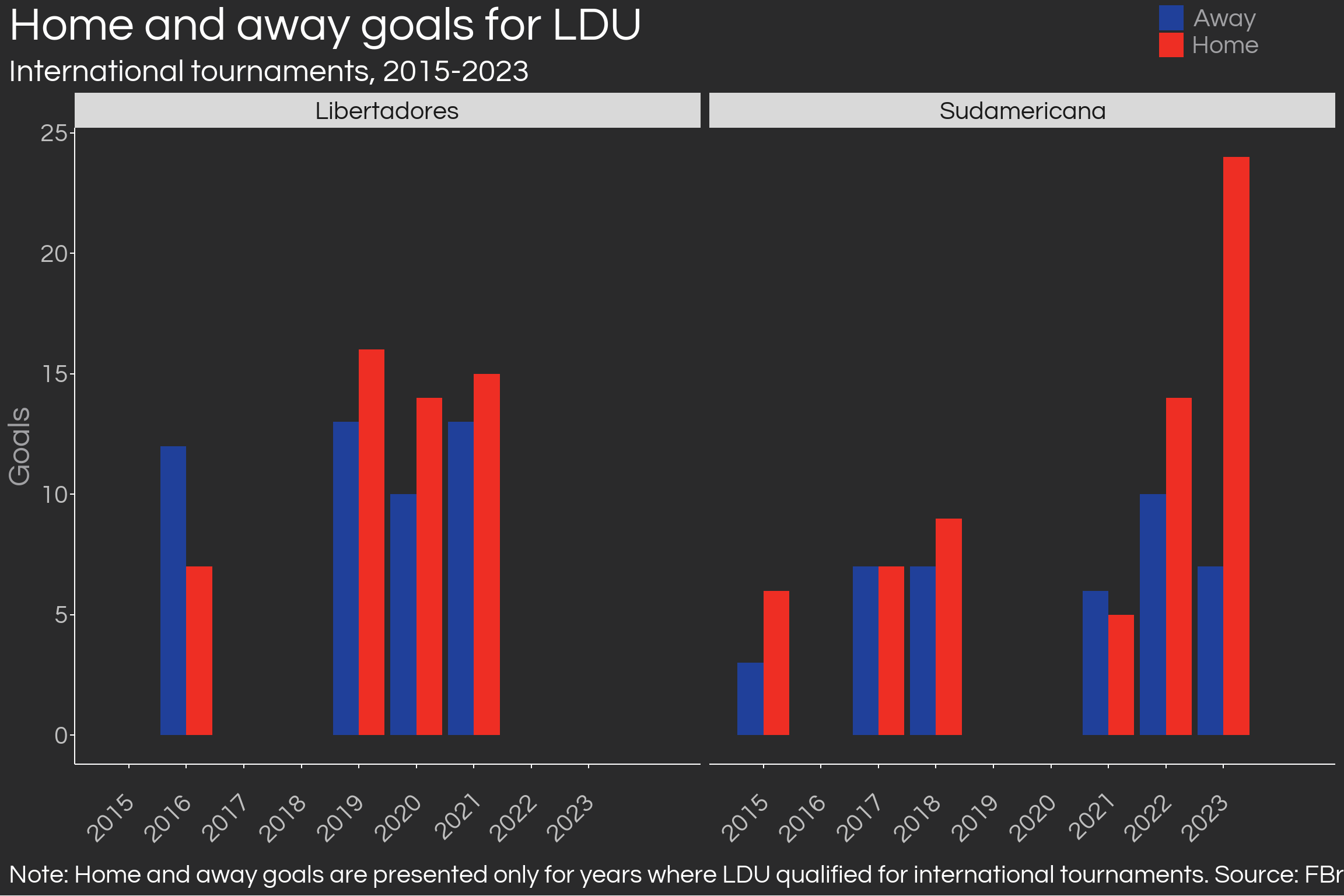 caption = str_wrap('Note: Home and away goals are presented only for years where LDU qualified for international tournaments. Source: FBref.', 120)) +