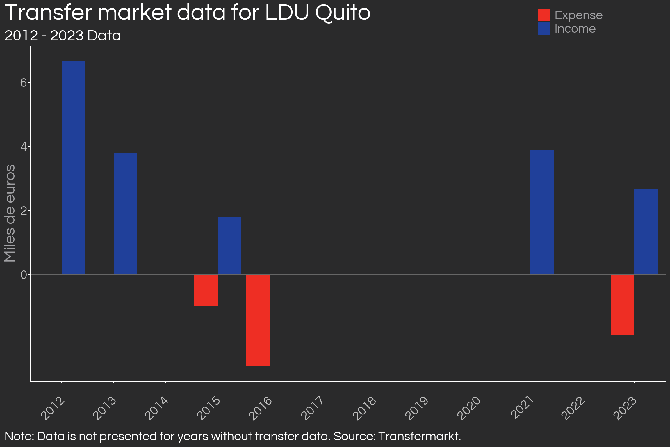Regarding investments, one indicator that rarely fails is money. How much has Liga de Quito invested in recent years to reach where they are today? This question might seem extremely complicated to answer, but Transfermarkt's data, a German platform known for its accuracy in transfer information and player values, makes it easier. The function that retrieves this information only allows viewing one year at a time, so I use a for loop (although loops are often feared in R, they are manageable) to obtain the information from recent years without having to call the function repeatedly.